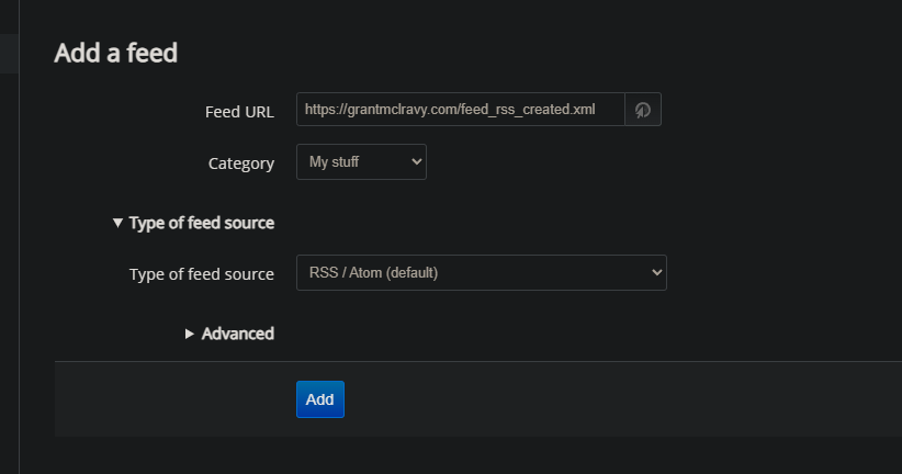 Once I successfully set up the plugin, it automatically set up an RSS feed for my site at https://grantmclravy.com/feed_rss_created.xml and set up the necessary headers in the <head> element of my blog.