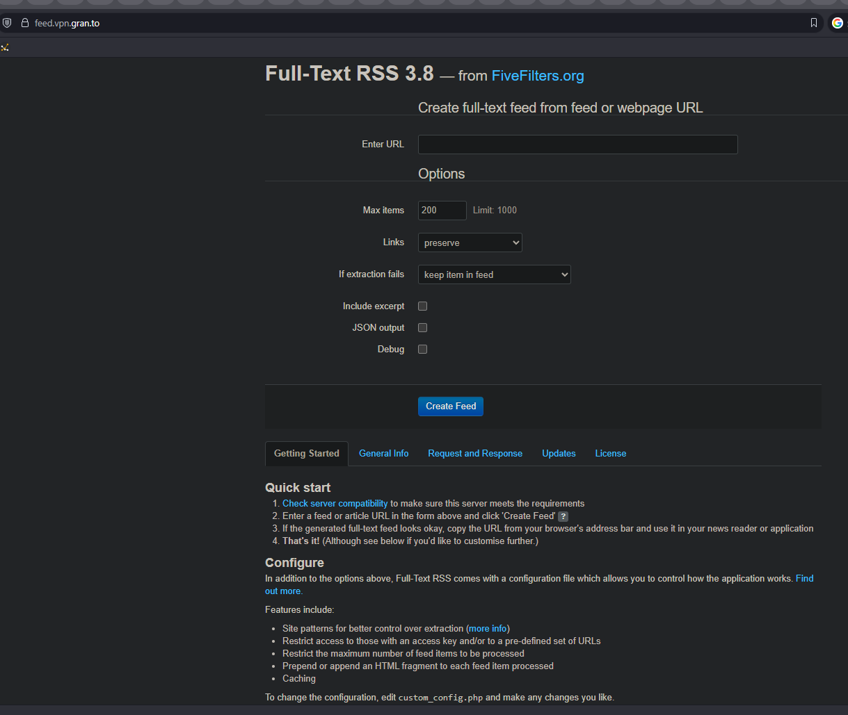 Using the same NPR feed from earlier, I pasted it in and let the container do its magic. The new feed https://feed.vpn.gran.to/makefulltextfeed.php?url=sec%3A%2F%2Ffeeds.npr.org%2F1001%2Frss.xml&max=200&links=preserve&exc=&submit=Create+Feed&parser=html5php included the complete article version of the articles, not just the summaries.