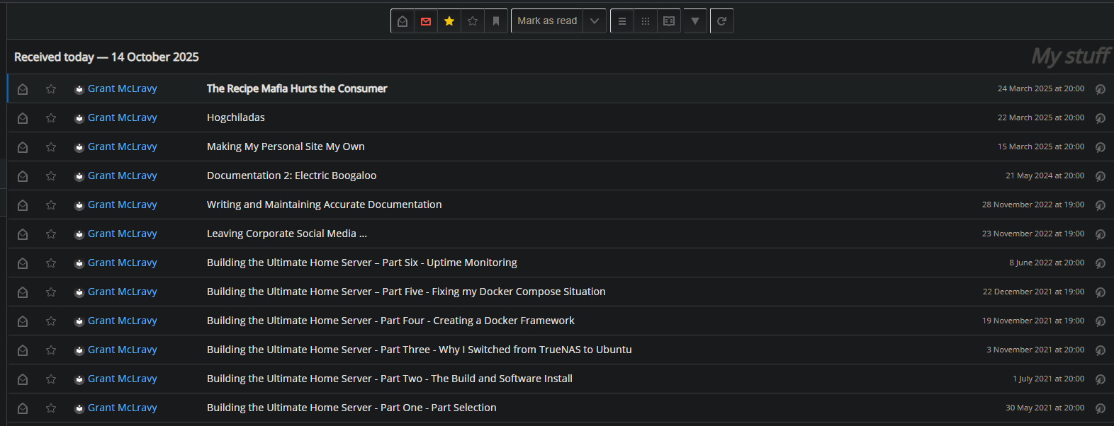 RSS feeds are a dying breed. They bring me back to a simpler time of the Web 2.0 internet - before everything was so commercialized and filled with AI slop.1 In those days, before modern social media giants controlled the vast majority of web traffic, the world-wide-web felt more whimsical and personal. RSS enabled you to retrieve other sites' content and bring them into your own reader, almost like an email inbox of articles.