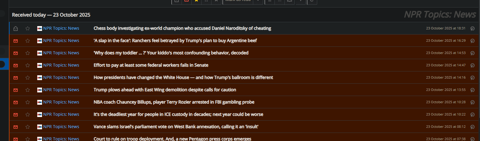 I hope to continue curating my RSS feeds, keeping a better relationship with scrolling through the news. Even though RSS feed readers have a familiar design to email inboxes, I don't want to have the expectation to read every article. The "mark all as read" button is my friend. The goal is to have the option to read media in this environment, not have another chore to clear out a notification number.